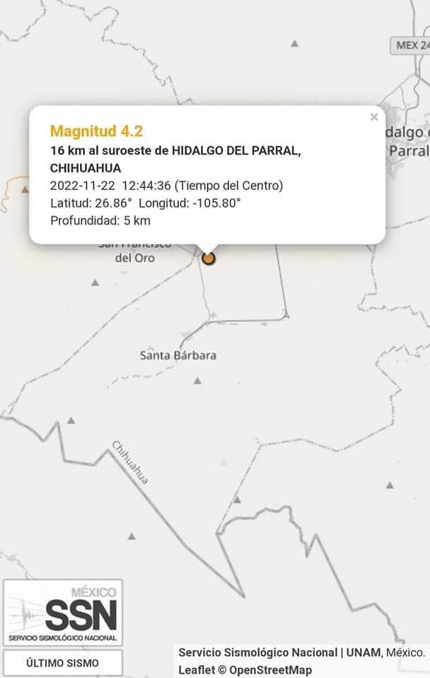 Chihuahua, Chih. – Hace unos minutos se registró de nueva cuenta un fuerte sismo en el municipio de Parral, el cual tuvo una magnitud de 4.2, por lo que también lograron sentirlo en algunos municipios cercanos.