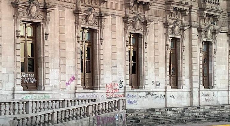 Grafitis y algunos vidrios quebrados en edificios públicos, fue el saldo que dejó la movilización de unas 60 mujeres quienes marcharon por la ciudad en protesta por la violencia de género.