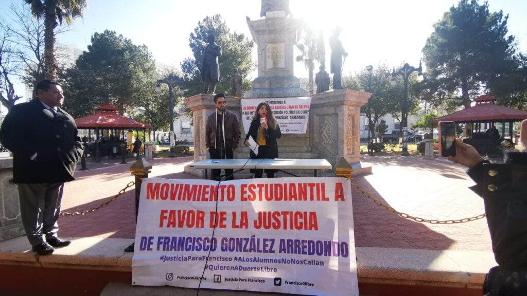 Alumnos de la Facultad de Derecho de la Universidad Autónoma de Chihuahua acudieron afuera de Palacio de Gobierno con el objetivo de manifestarse a favor de la liberación del docente y ex fiscal Francisco González Arredondo.