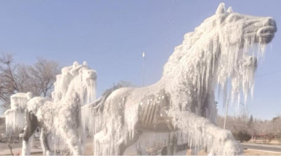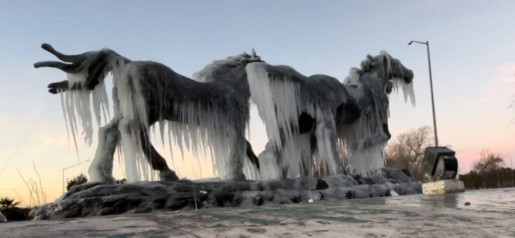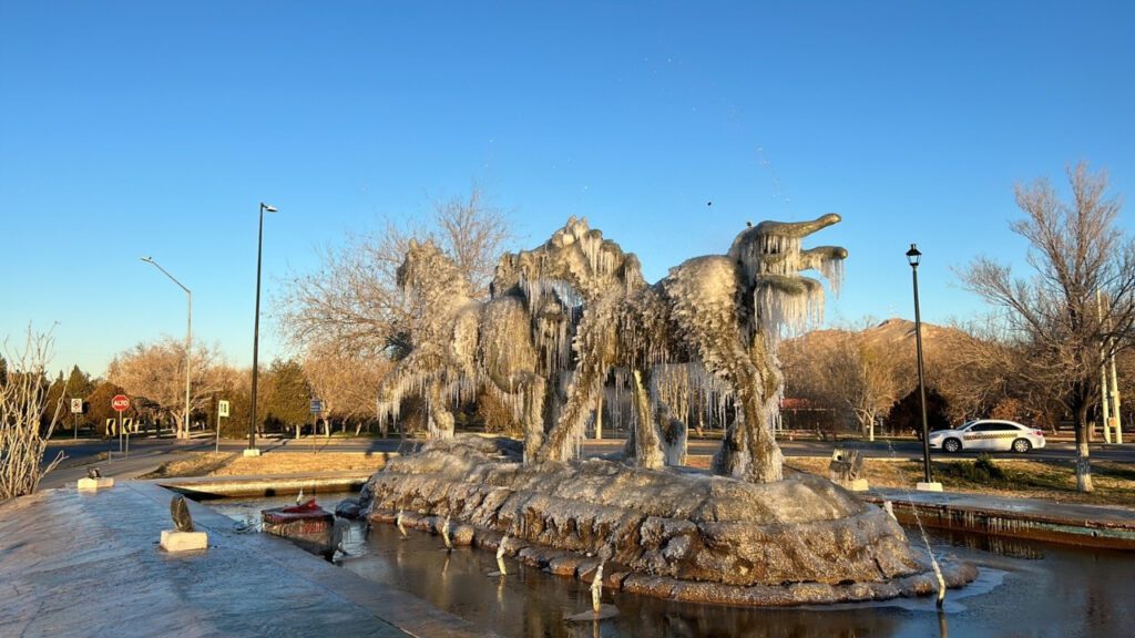 Las temperaturas de hasta -7 grados centígrados sentidas en Juárez en las últimas horas, provocaron el congelamiento del icónico monumento “Los Indomables”, situación que ha sido aprovechada por los juarenses para tomarse fotos.