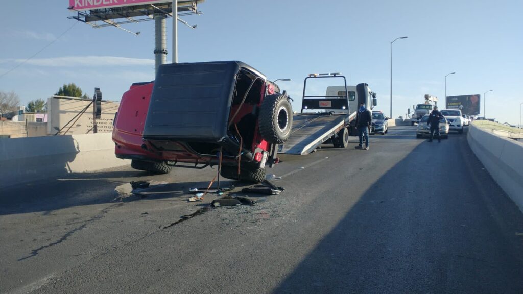 Debido al exceso de velocidad en una curva pronunciada, el conductor de un Jepp 4×4 volcó sobre el puente del Teófilo Borunda y casi Diaz Ordaz en la zona centro, en un percance en el que por fortuna solo hubo daños materiales.