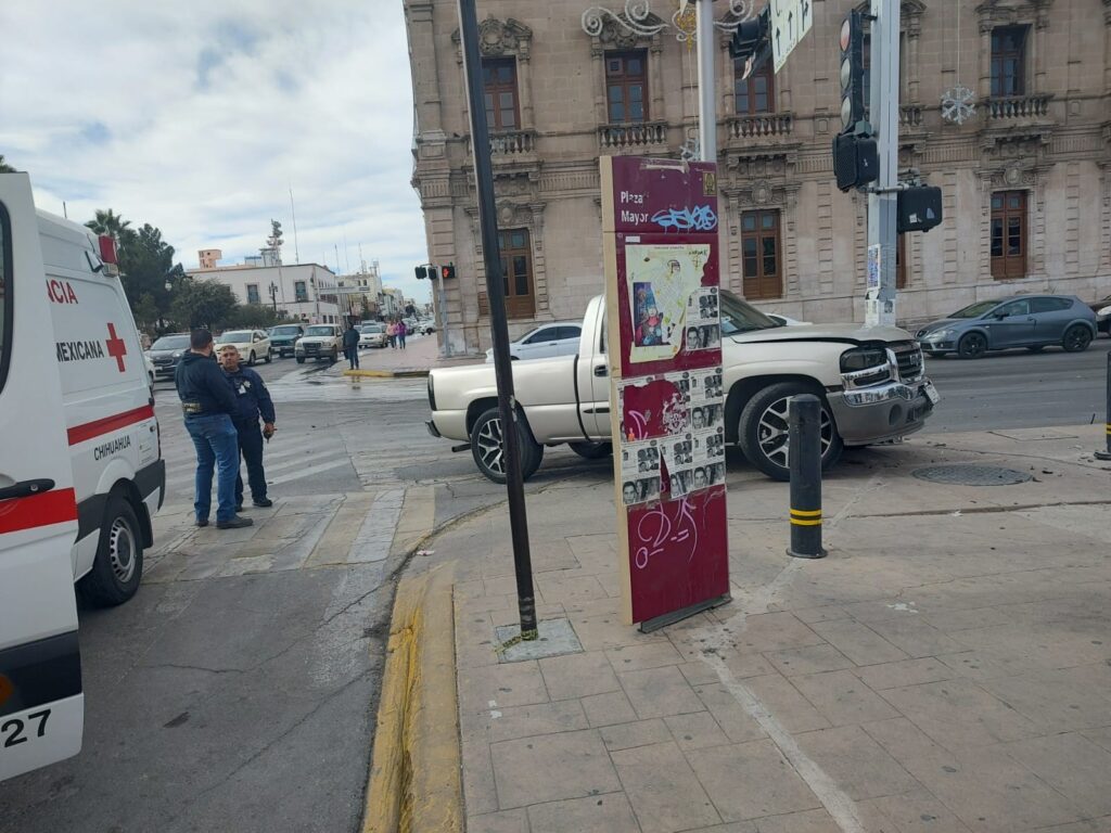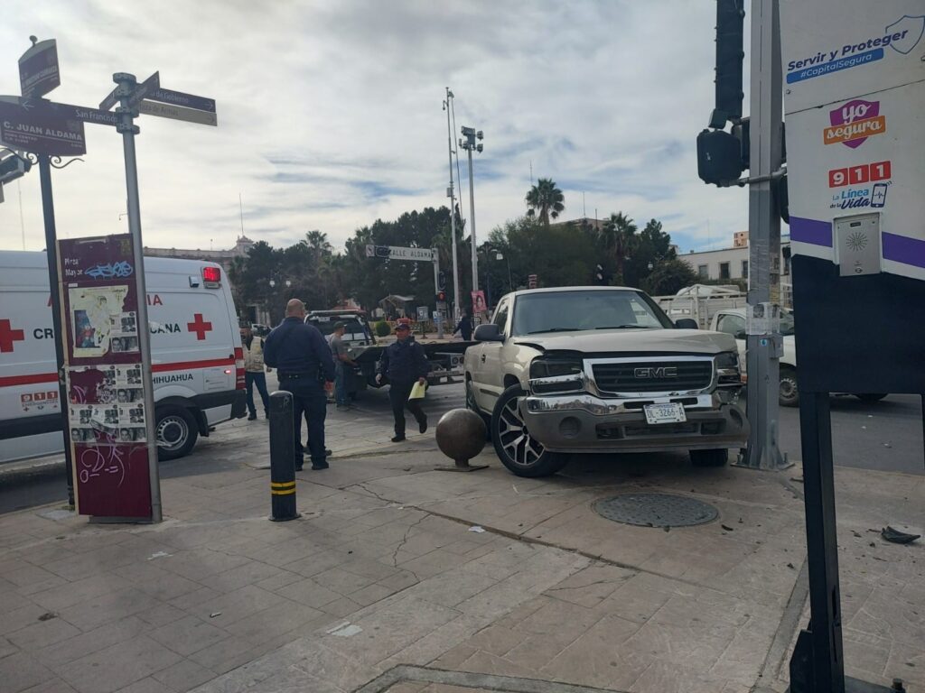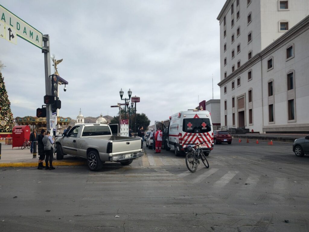 Los hechos ocurrieron en el semáforo del cruce de las calles Aldama y Venustiano Carranza donde el vehículo plata impactó a una troca GMC color arena.