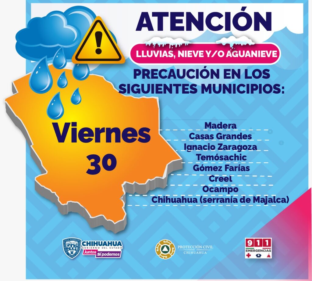 Así mismo el SMN informó que prevén condiciones para caída de aguanieve o nieve en diferentes partes de la sierra de Chihuahua. Incluso es necesario mencionar que Gobierno del Estado anunció cuales son los posibles municipios en los cuales podría haber presencia de lluvia, agua nieve o hasta nieve.