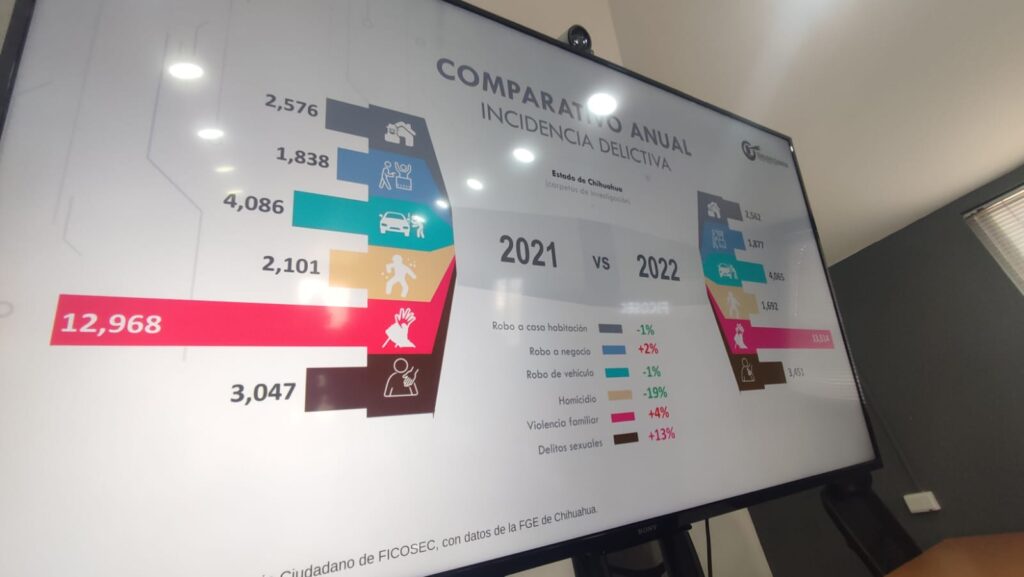 Mientras que en el estado de Chihuahua la violencia familiar creció un cuatro por ciento al comparar el año 2022 con el 2021 registrando 13 mil 514 carpetas de investigación en el año anterior mientras que hace dos años se registraron 12 mil 968. Sin embargo, en el caso de los homicidios bajaron un 19% el año anterior en comparación con un par de años.