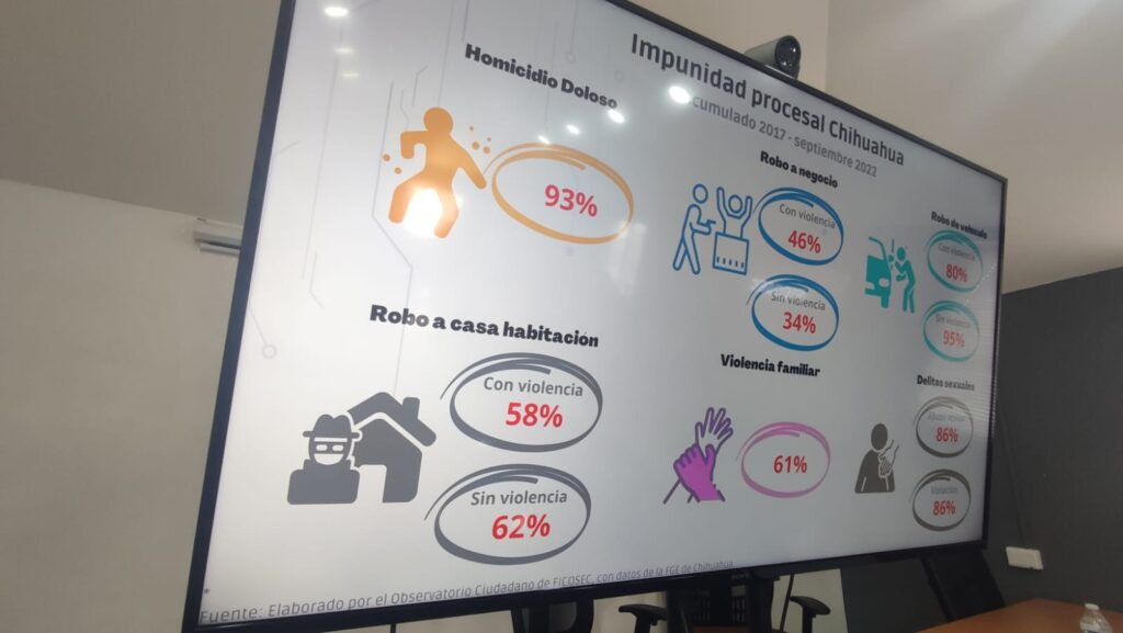 Cabe resaltar que en impunidad procesal el homicidio doloso destacó con 93 por ciento mientras que el robo a vehiculo con violencia es de 80, mientras que sin violencia es de 95; en el caso de abuso sexual y violación fue del 86.