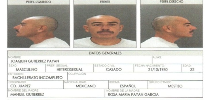 Fuentes internas de la Fiscalía General del Estado, dieron a conocer la identidad del reo evadido que fue captado intentando huir a El Paso; se trata de Joaquín Gutiérrez Payán, preso desde el 22 de agosto del año 2012 en el Centro de Readaptación Social (Cereso) número 3.