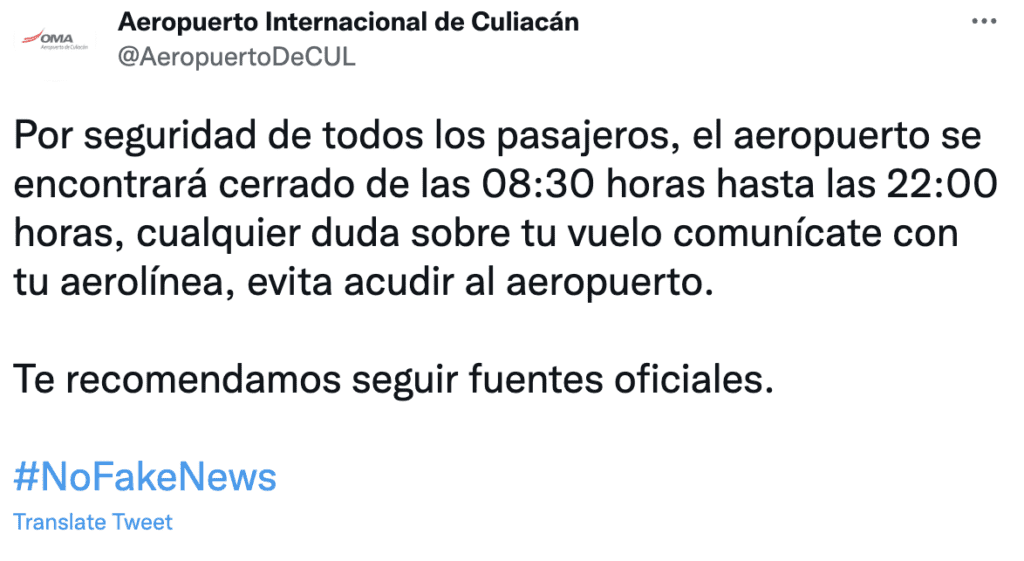 Además el Aeropuerto a través de un comunicado oficial informó que por el día 5 de enero estará cerrado hasta las 10 de la noche con la finalidad de salvaguardar la seguridad de los sinaloenses.