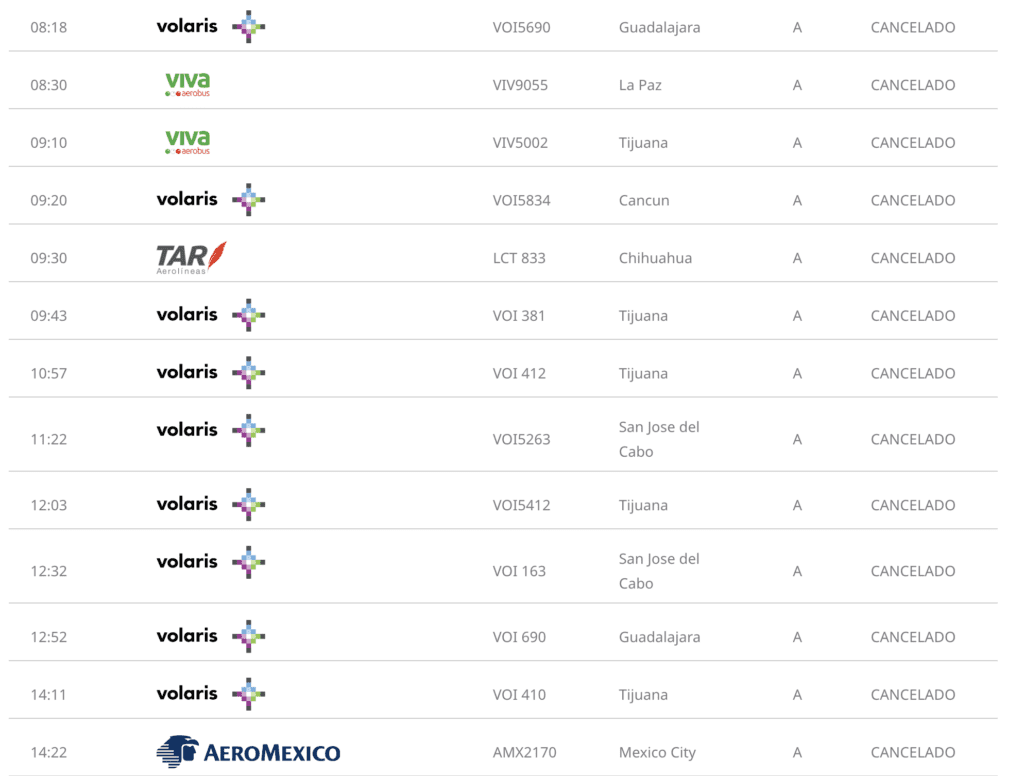 Esta es la lista de los vuelos que fueron cancelados, uno de ellos tenía destino a Chihuahua: