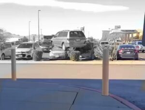 De manera inexplicable, una camioneta quedó encima de dos autos en el estacionamiento de Bassett Place, suceso que fue captado por paseantes. Hasta el momento la Policía de