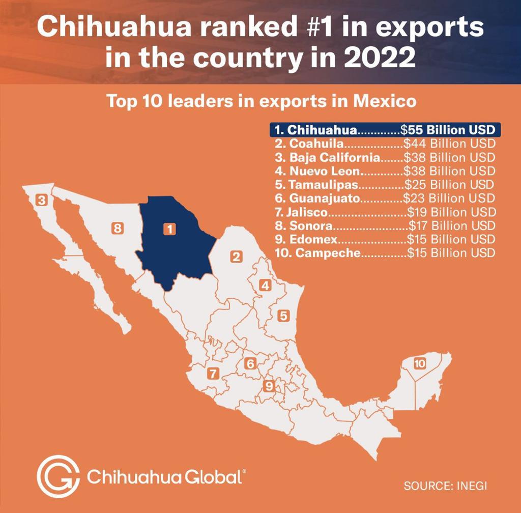 De acuerdo a datos recabados por el Instituto Nacional de Estadística y Geografía, el estado de Chihuahua se coronó como el estado número 1 en exportación generando una cantidad de 55 billones de dólares.
