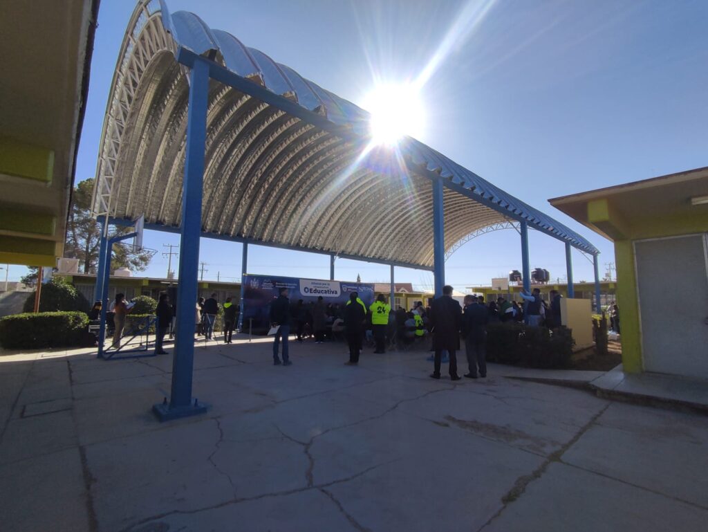 Chihuahua, Chih.- En evento encabezado por el Alcalde, Marco Bonilla, fue inaugurado un domo metálico que cubrirá la cancha central del Centro de Atención Múltiple (CAM) número 24 ubicado en la colonia Palestina, al sur de la ciudad.