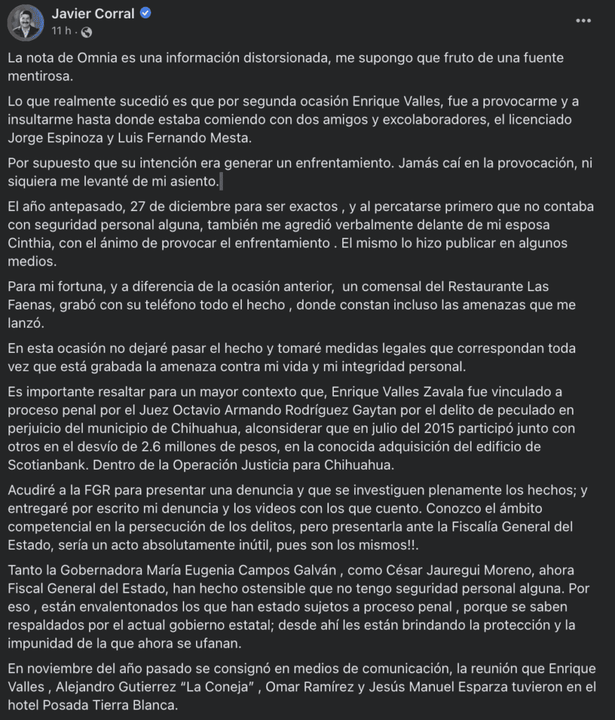 Esta situación derivó a que se hizo viral un vídeo en que se aprecia como Corral y Valles protagonizaron una riña afuera del restaurante “Las Faenas” pero de acuerdo al ex panista, las cosas no pasaron como se observa en el contenido multimedia.