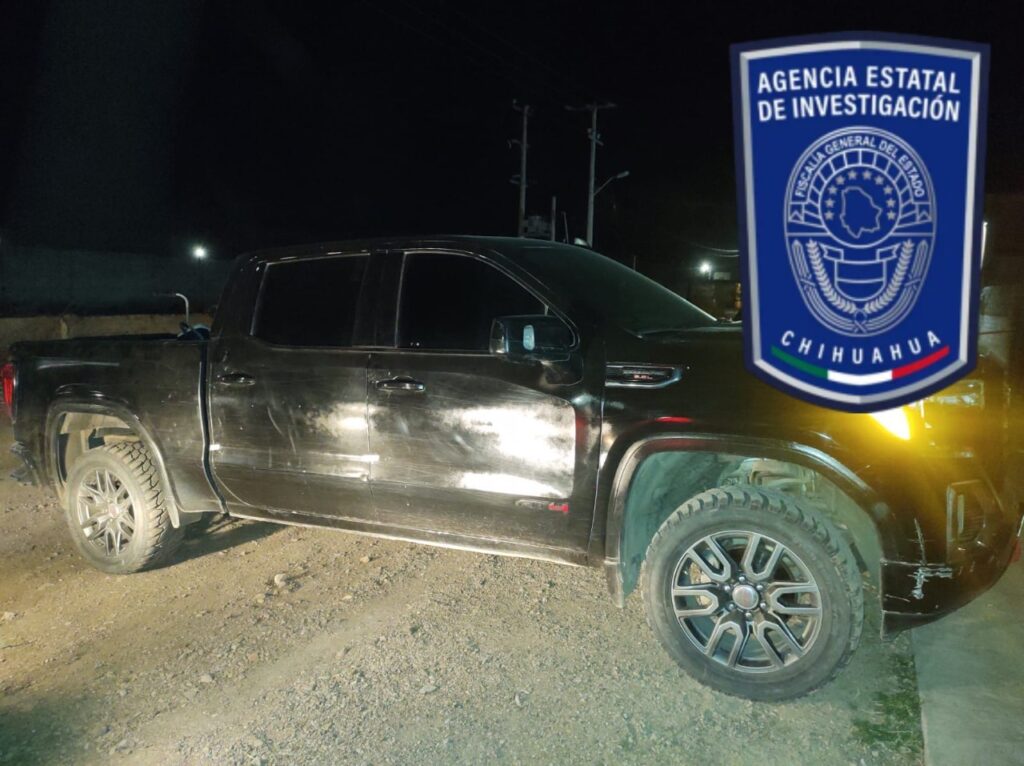 18. Un vehículo de la marca GMC Sierra Color negro con matrícula del estado de Chihuahua, la cual cuenta con reporte de robo.