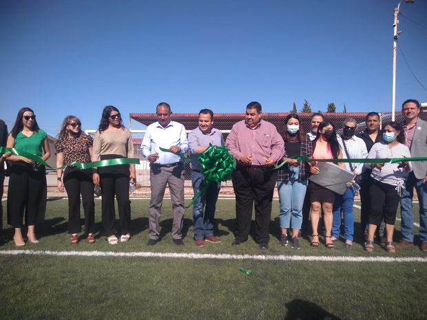 Ambos, el profesor José Alfredo Chávez y el ingeniero Jesús Valenciano, así como el director Raúl Carmona, acompañados de otras personalidades, cortaron el listón inaugural y dieron la patada con la que oficialmente se puso en funcionamiento esta nueva cancha.