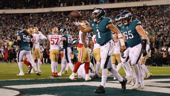 Estadística subestimada: Al iniciar el año, los Eagles habían corrido para tres o más touchdowns en un juego de playoffs solo una vez en su historia. Lo han hecho dos veces este año, corriendo para cuatro el domingo (tres en la primera mitad) después de correr para tres anotaciones la semana pasada en su victoria en la ronda divisional sobre los Giants. –Tim McManus