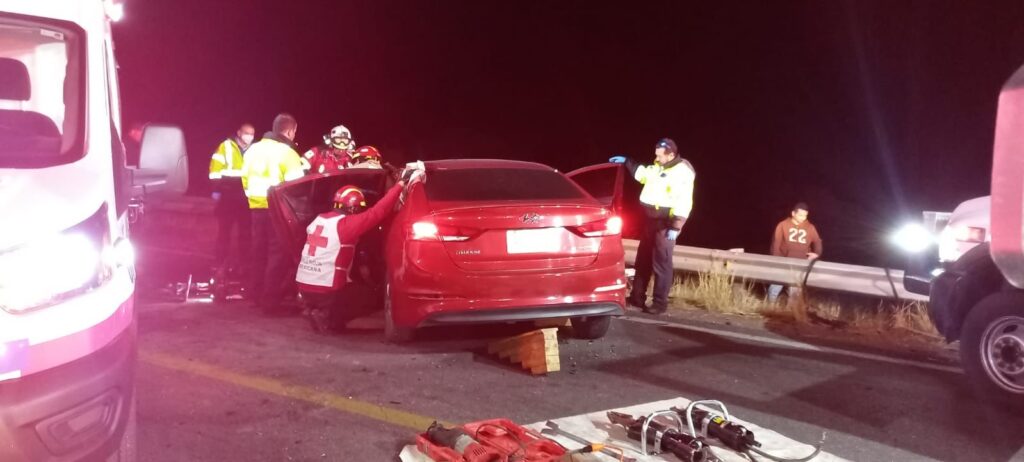 Esta noche se registró un aparatoso choque de frente entre un tráiler y un automóvil sobre la carretera libre a Juárez, lo que dejó a la conductora herida y atrapada entre los fierros de la unidad.