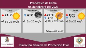 Ciudad Juárez Chihuahua.-La Dirección General de Protección Civil, con base en informes del Servicio Meteorológico Nacional, pronostica un domingo soleado con una temperatura máxima de 23 grados Celsius,