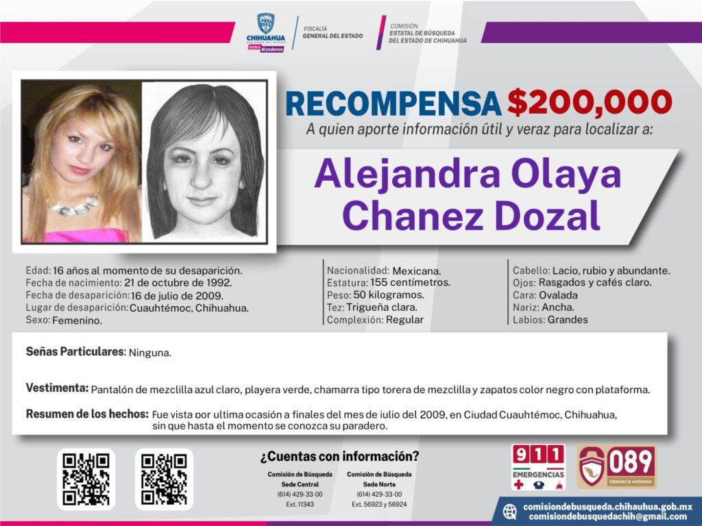 La Comisión Estatal de Búsqueda ofreció una recompensa de 200 mil pesos a quien aporte información útil y veraz para localizar a Alejandra Olaya Chanez Dozal, quien tenía 16 años al momento de su desaparición en Ciudad Cuauhtémoc, el 16 de julio del año 2009.