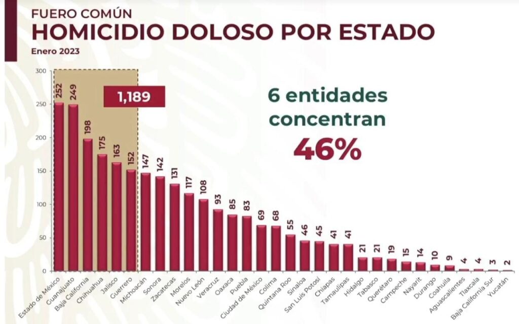 Ante esto, se especificó que contabilizaron un total de 175 asesinatos en los últimos días por lo que ocupa uno de los top 5 de estados con más homicidios en todo el país, Así mismo, en la gráfica se mencionan 6 entidades concentran 46 por ciento de homicidios en México tres primeros lugares son el Estado de México con 252; Guanajuato son 249; Baja California con 198; Jalisco 163 y 152 en Guerrero.