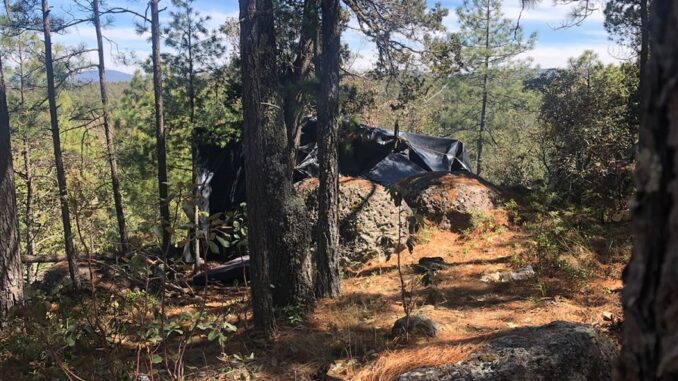 En uno de los recorridos que realizan los integrantes del Operativo Guachochi, en la carretera que conduce al poblado de Yoquivo, se localizó un campamento utilizado por personas integrantes de la delincuencia organizada.