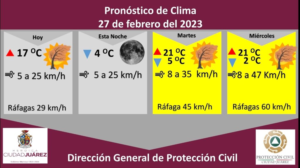 La Dirección General de Protección Civil, con base en informes del Servicio Meteorológico Nacional, pronostica para este lunes una temperatura máxima de 17 grados Celsius con fuertes ráfagas de viento que alcanzarán los 29 kilómetros por hora, informó Roberto Briones Mota, titular de la dependencia.