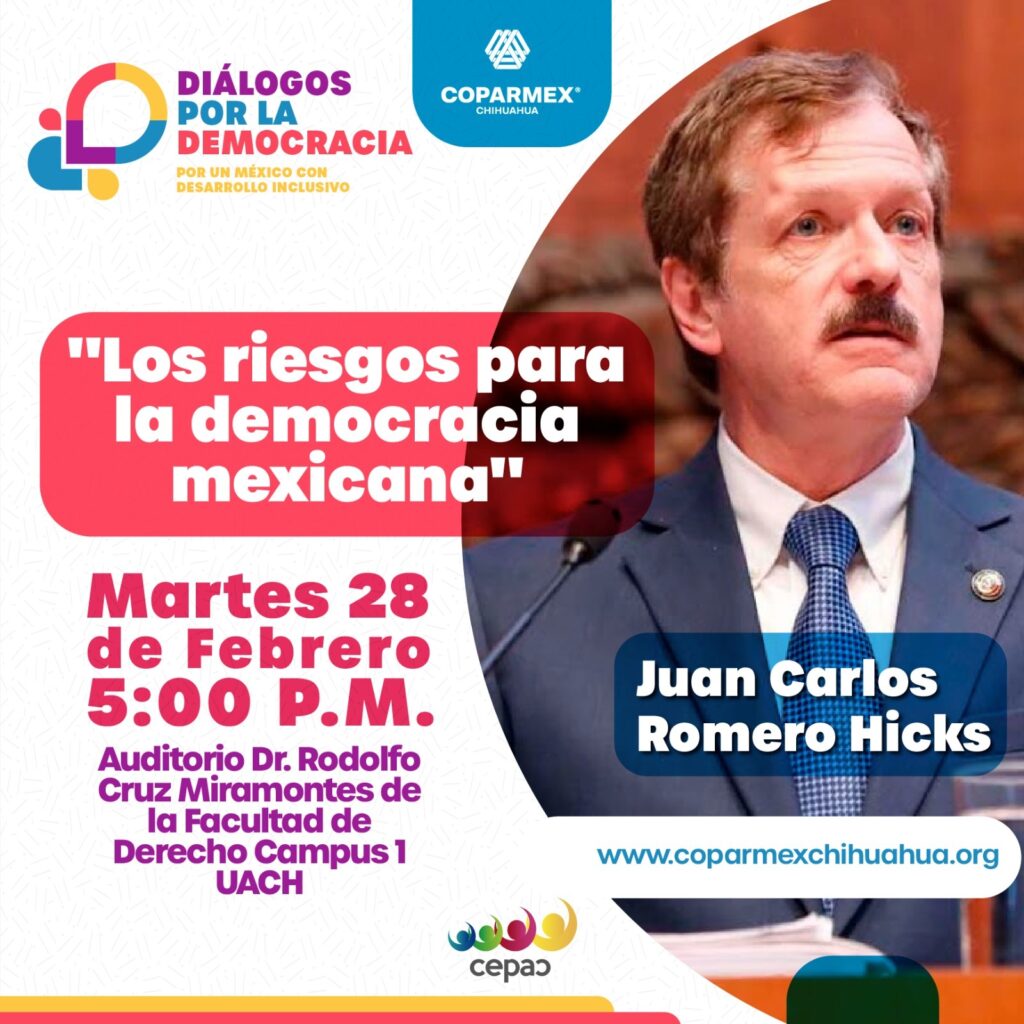 Explicó el titular de Coparmex que con el fin de brindar conocimiento en cuestión política, “Diálogos por la Democracia” traerá mañana a Carlos Romero Hicks para aquellas personas que quieran asistir por la tarde y tener mayor conocimiento sobre la situación actual que se está viviendo en el país.