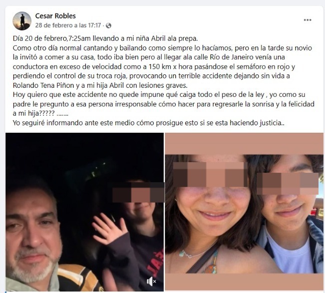 Hoy quiero que este accidente no quede impune qué caiga todo el peso de la ley , yo como su padre le pregunto a esa persona irresponsable cómo hacer para regresarle la sonrisa y la felicidad a mi hija???”.