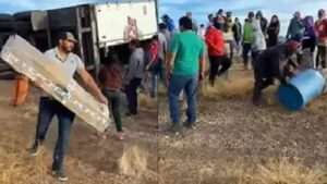 El camión quedó sobre uno de sus costados y con la caja cerrada, sin embargo, las decenas de personas no respetaron a los guardias nacionales y perforaron el