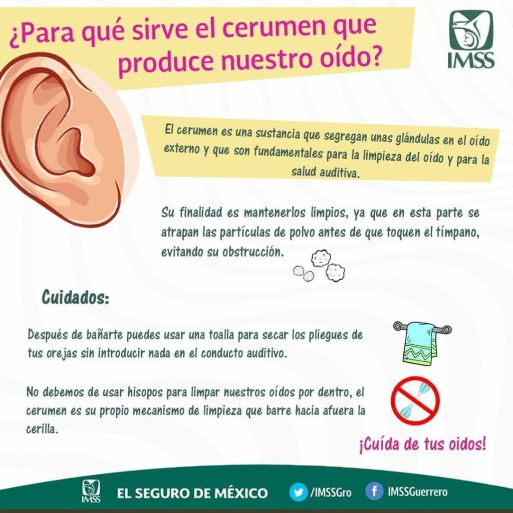 El Instituto Mexicano del Seguro Social (IMSS) en Chihuahua destaca que la cera de los oídos tiene funciones importantes, entre las que destaca una limpieza natural del canal auditivo, por lo que no recomienda el uso de hisopos u otros instrumentos para esta tarea.