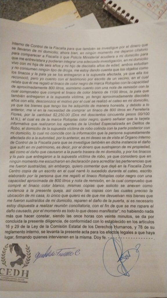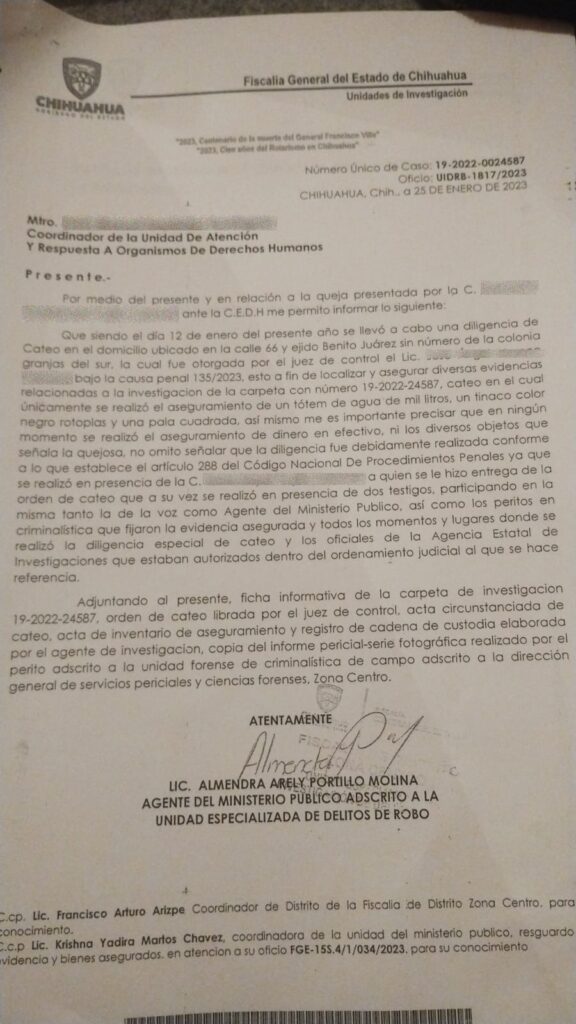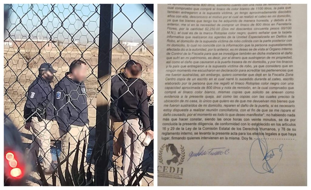 Chihuahua, Chih.-Fue el 12 de enero de 2023 a las 10 de la mañana cuando Guadalupe regresaba de una junta escolar de su hija de 6 años cuando a lo lejos pudo observar alrededor de 15 vehículos particulares y varios supuestos elementos de la Unidad de Robos de la Zona Centro y de la Agencia Estatal de Investigación entrando a su casa para llevarse todo aquel objeto de valor que no tuviera una factura debido a una demanda por robo simple que ella desconocía, señalando que incluso las autoridades se llevaron 5 mil pesos sin mostrar la orden de cateo correspondiente, acto que fue negado por la encargada de la operación.