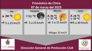 La Dirección General de Protección Civil, con base en informes del Servicio Meteorológico Nacional, pronostica un martes soleado con una temperatura máxima de 24 grados Celsius, mientras que