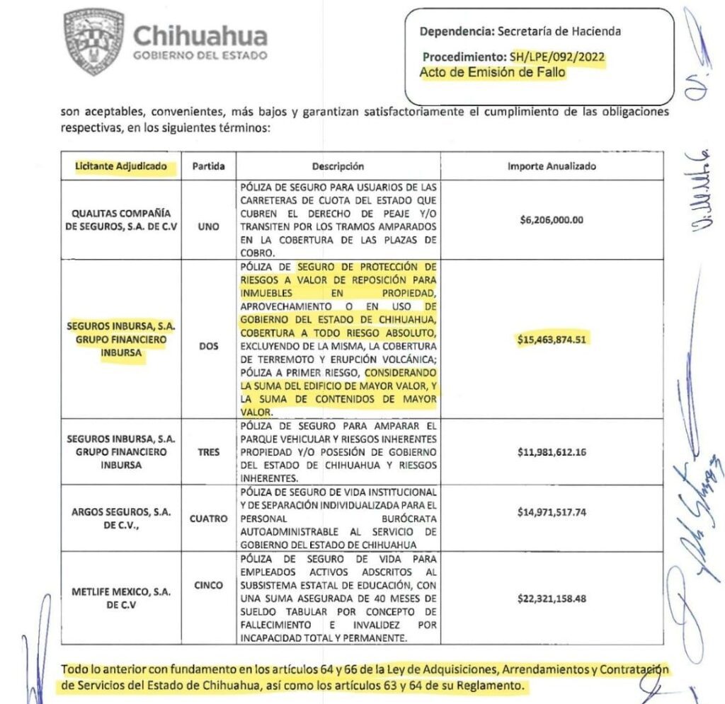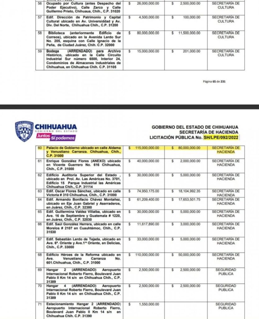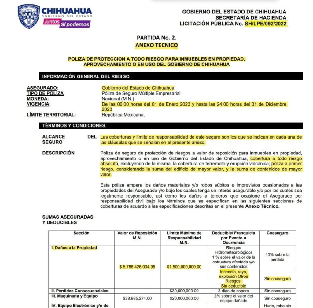 En las imágenes se puede observar que tienen un seguro de protección de riesgos a valor de reposición para inmuebles en propiedad, aprovechamiento o en uso del Gobierno del Estado de Chihuahua.