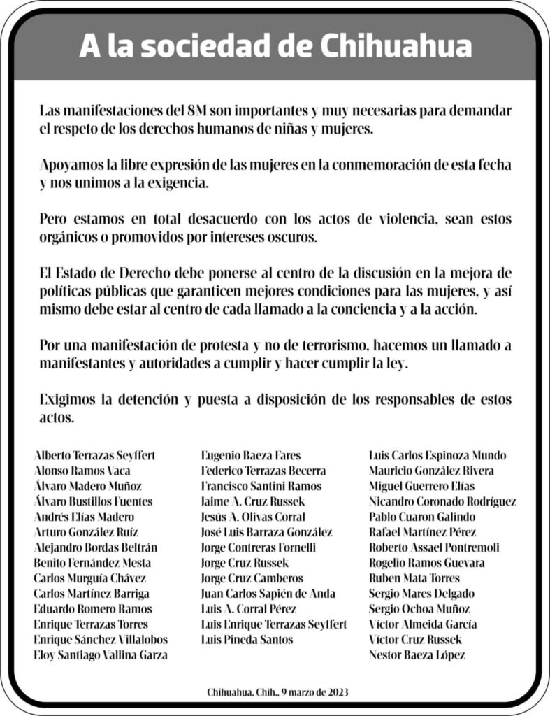 El desplegado que circuló en medios impresos reunió a 3 decenas de los empresarios más importantes de Chihuahua, actuaron de forma rápida y contundente ante un problema social que es evidente pero también interesados por evitar que el caos se arraigue en Chihuahua.