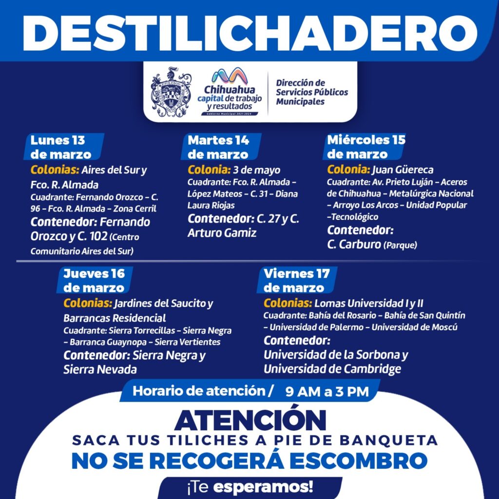 Chihuahua, Chih. A 11 de marzo del 2023.- El Gobierno Municipal de Chihuahua que encabeza el alcalde Marco Bonilla, a través de la Dirección de Servicios Públicos Municipales, informa a la ciudadanía el calendario del programa Destilichadero que se realizará del 13 al 17 de marzo en ocho colonias de Chihuahua Capital.