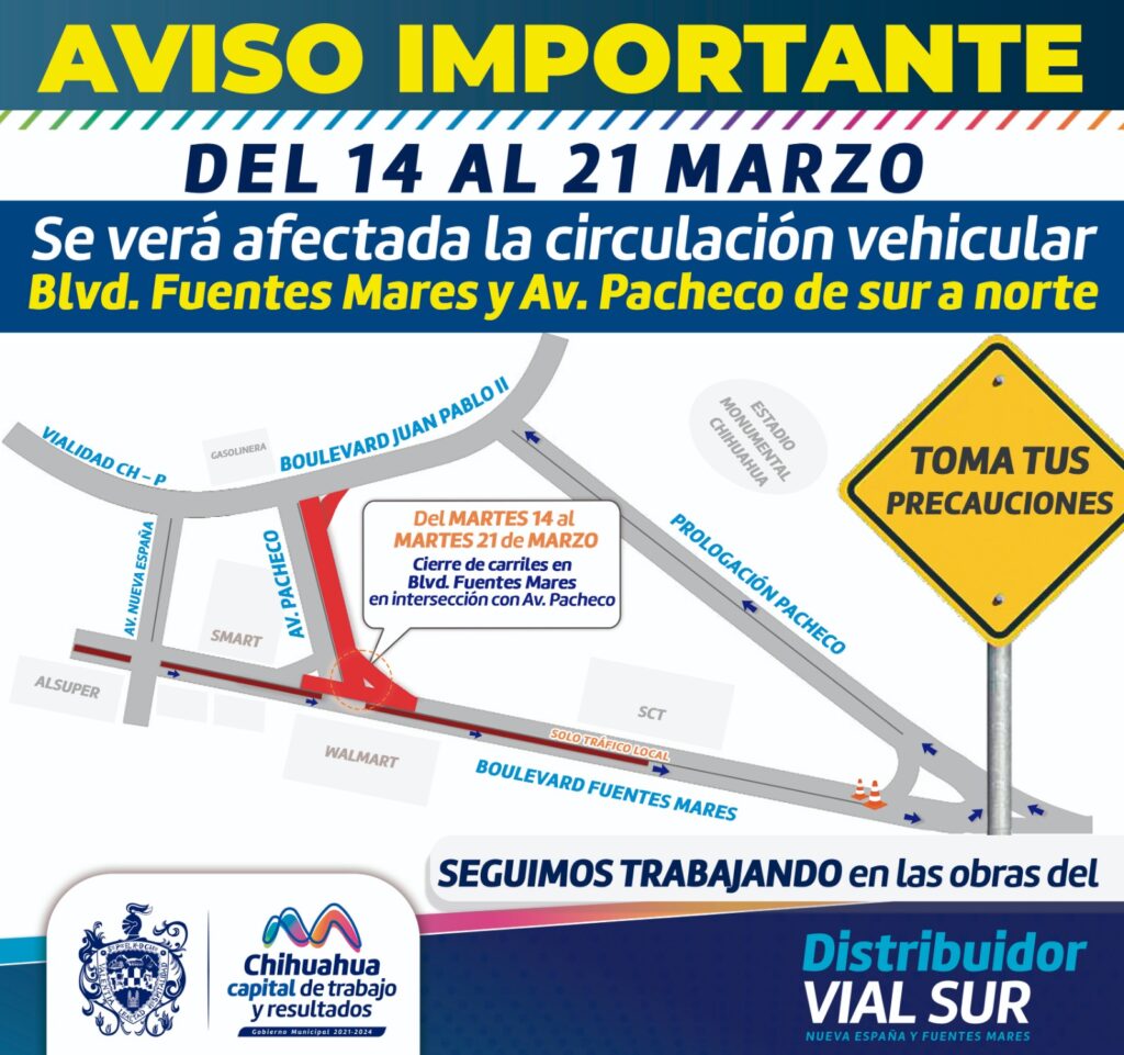 A partir de mañana y hasta el 21 de marzo, se verá afectada la circulación del boulevard Fuentes Mares, en la intersección de la avenida Pacheco de sur a norte, debido a los trabajos que se realizan en el distribuidor vial.
