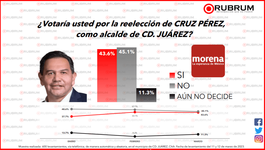 Chihuahua, Chih.- La casa encuestadora RUBRUM dio a conocer los resultados del trabajo informativo realizado durante el mes de marzo, en cuestión a la posibilidad de reelección que tienes varios Alcaldes del País, apareciendo, Cruz Pérez Cuellar, Presidente Municipal de Ciudad Juárez.