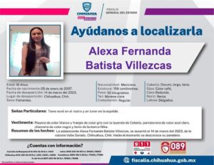 La Fiscalía General del Estado emitió pesquisas para solicitar el apoyo de la ciudadanía con el fin de localizar a Alexa Fernanda Batista Villezcas, estudiante del Cbtis, quien