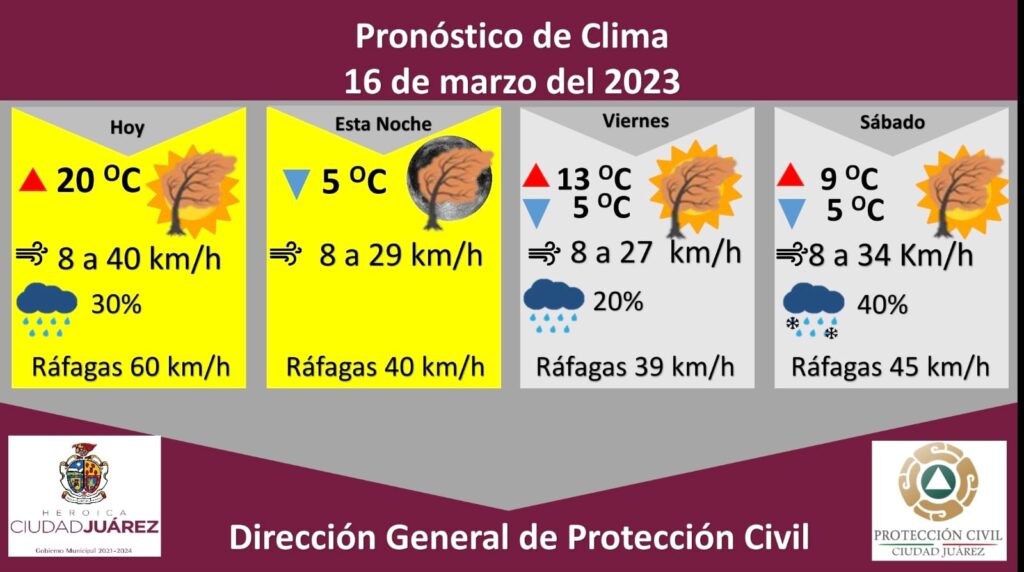 La Dirección General de Protección Civil, con base en informes del Servicio Meteorológico Nacional, emite una alerta amarilla debido a fuertes ráfagas de viento que alcanzarán los 60 kilómetros por hora, además de la probabilidad de lluvia de un 30 por ciento.