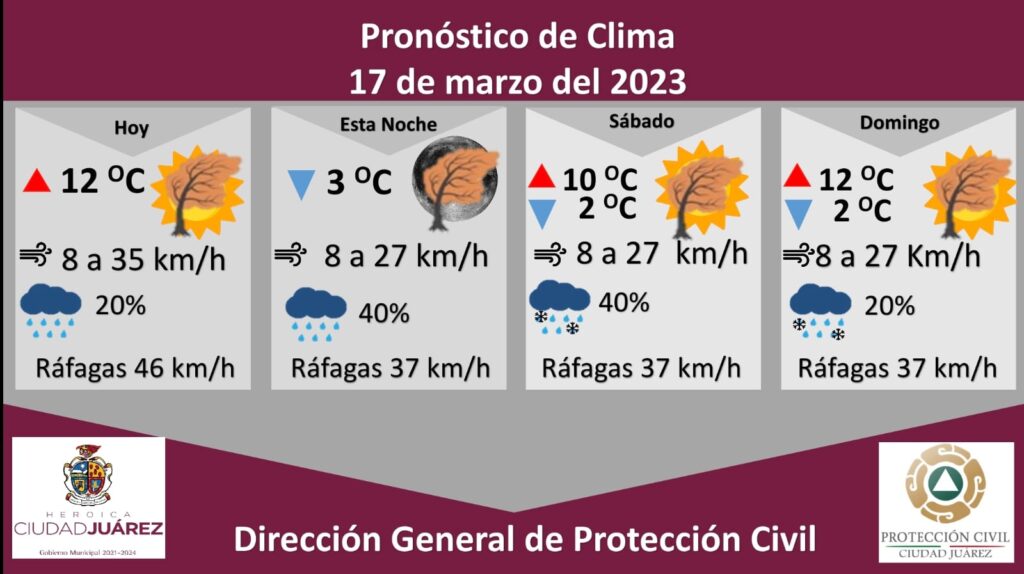La Dirección General de Protección Civil, con base en informes del Servicio Meteorológico Nacional, pronostica para este viernes ráfagas de viento que alcanzarán los 46 kilómetros por hora, además de un 40 por ciento de probabilidad de lluvia, principalmente por la tarde y noche.
