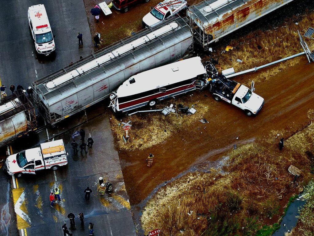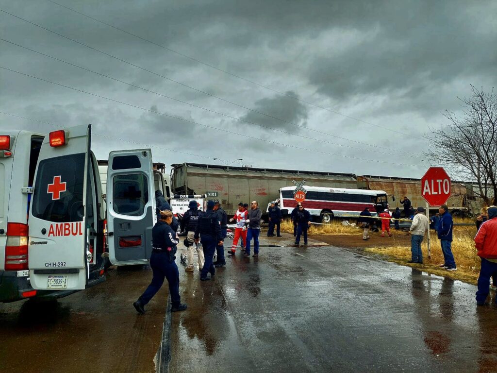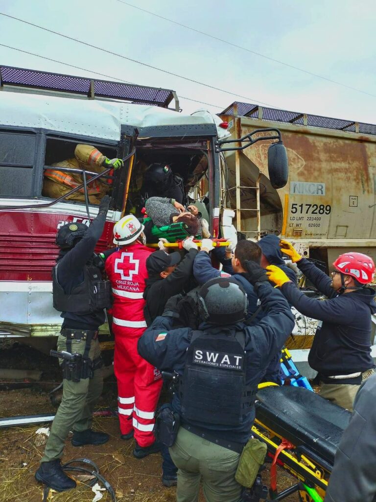 Elementos de la Secretaría de Seguridad Pública del Estado (SSPE) pertenecientes a la Policía del Estado y a nuestros grupos especiales SWAT y Detectives, atendieron el percance vial entre un tren y un camión de transporte de personal de una maquila y apoyaron con el rescate de los pasajeros que quedaron atrapados.