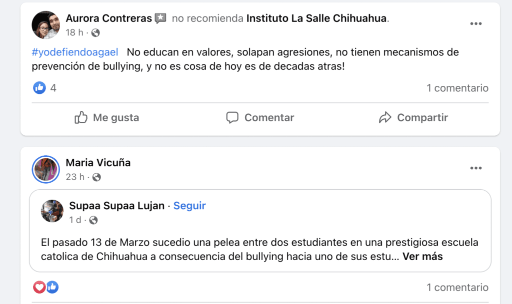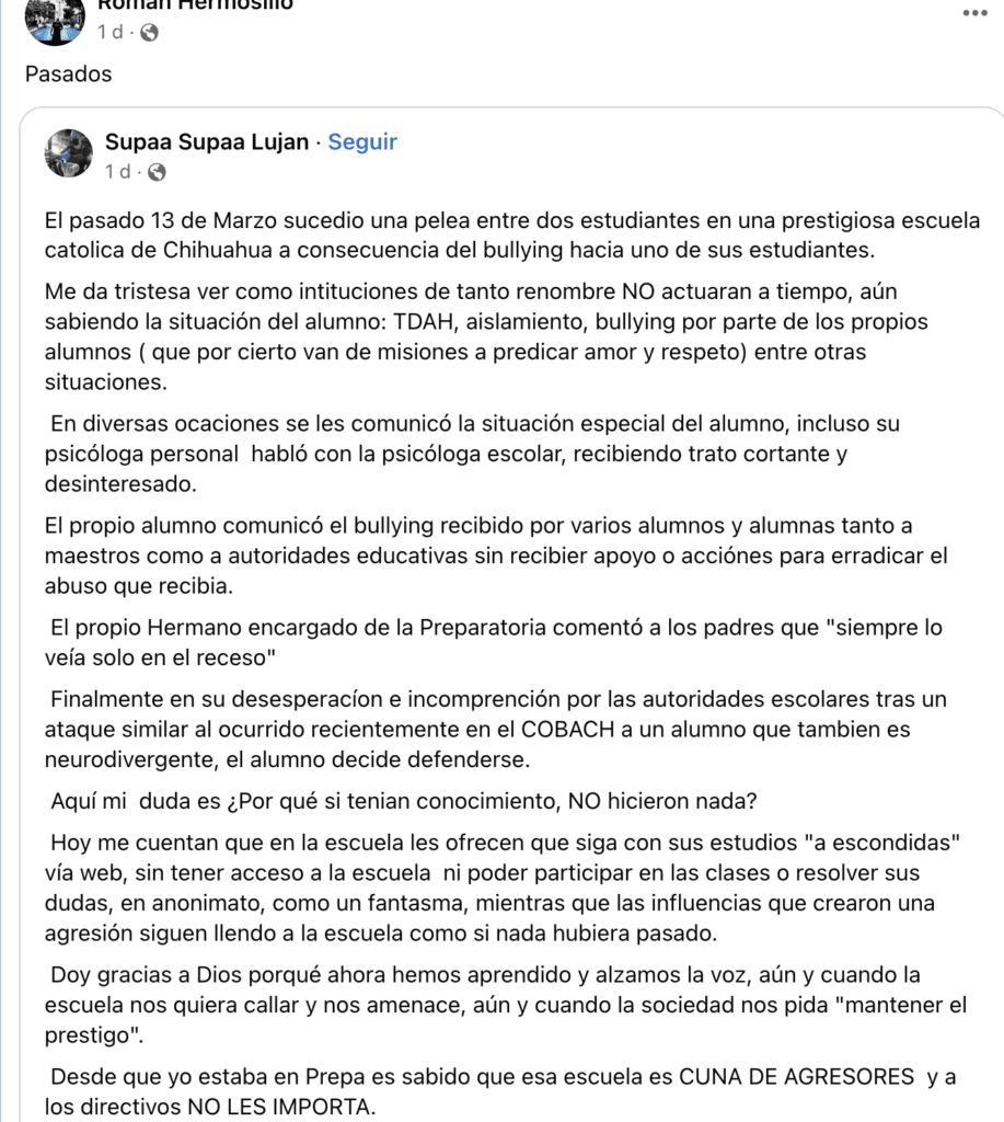 “Hoy me cuentan que en la escuela les ofrecen que siga con sus estudios “a escondidas” vía web, sin tener acceso a la escuela ni poder participar en las clases o resolver sus dudas, en anonimato, como un fantasma, mientras que las influencias que crearon una agresión siguen yendo a la escuela como si nada hubiera pasado.”, indicó un familiar de la víctima.