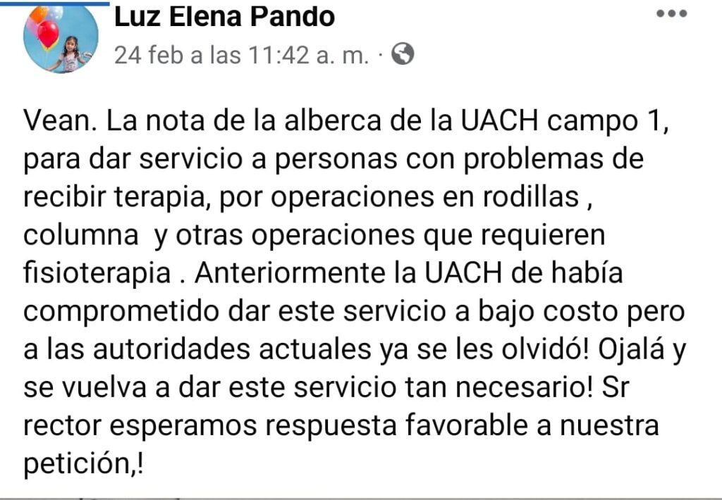 Los usuarios recalcaron, “Anteriormente la UACH de había comprometido dar este servicio a bajo costo pero a las autoridades actuales ya se les olvidó! Ojalá y se vuelva a dar este servicio tan necesario! Sr rector esperamos respuesta favorable a nuestra petición,”