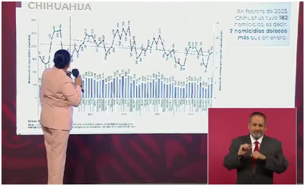 Continúa Chihuahua siendo de los estados donde se registran más homicidios tras registrar 182 asesinatos solo en febrero, con estas cifras, superó a enero con 7 más, así lo mostró Rosa Icela Rodríguez Velázquez, secretaria de Seguridad y Protección Ciudadana.