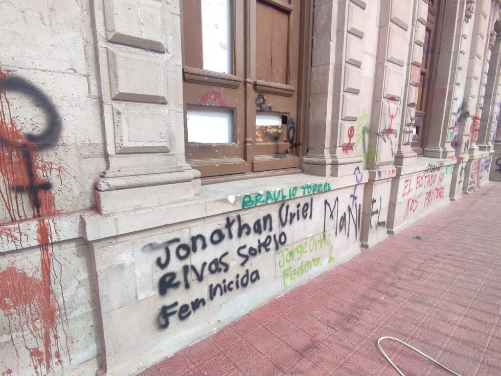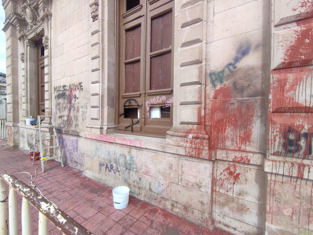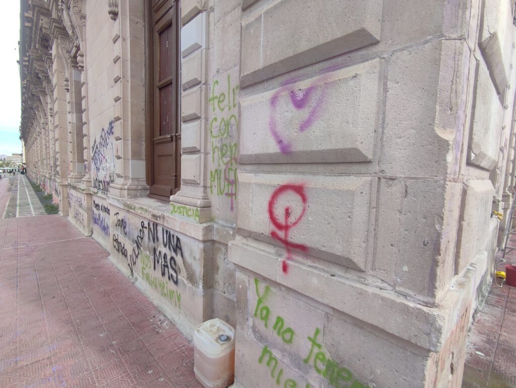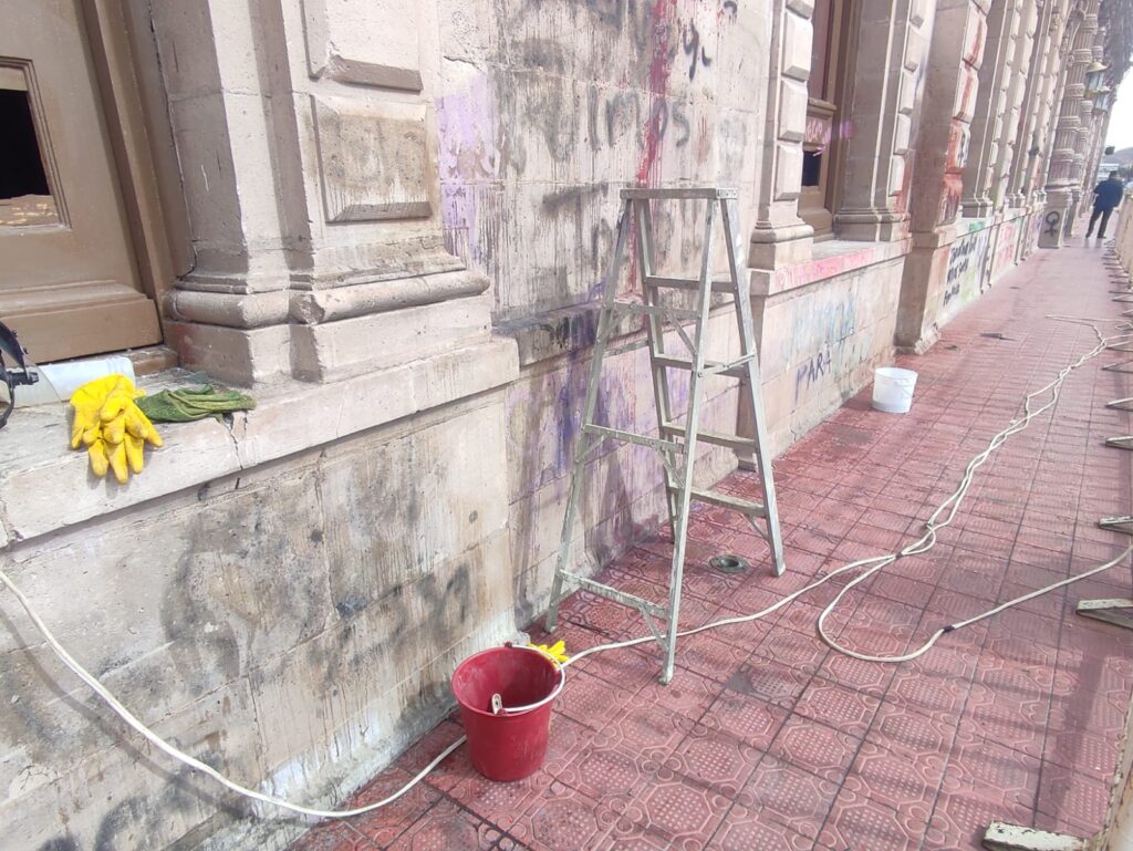 Empleados comenzaron a limpiar las pintas en Palacio de Gobierno que se generaron durante la marcha del Día Internacional de la Mujer el pasado 8 de marzo y tardarán más de 4 semanas para que quede limpio.