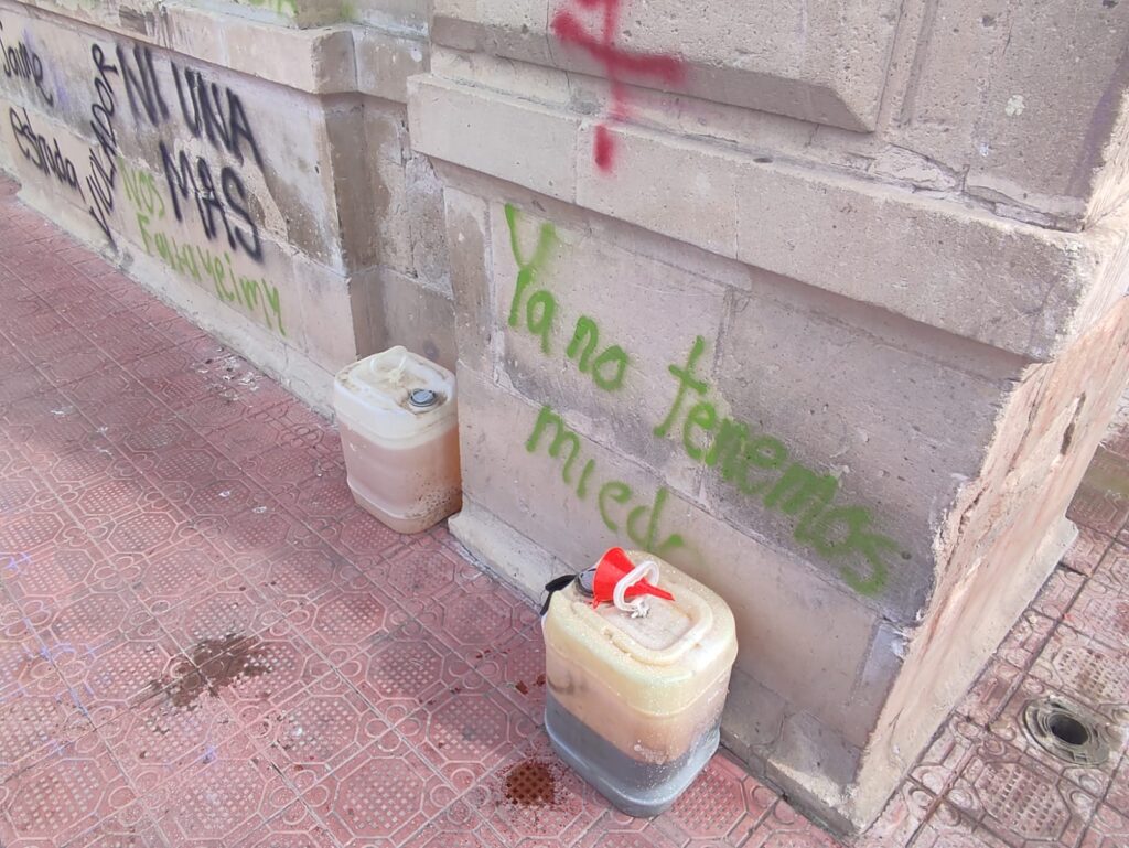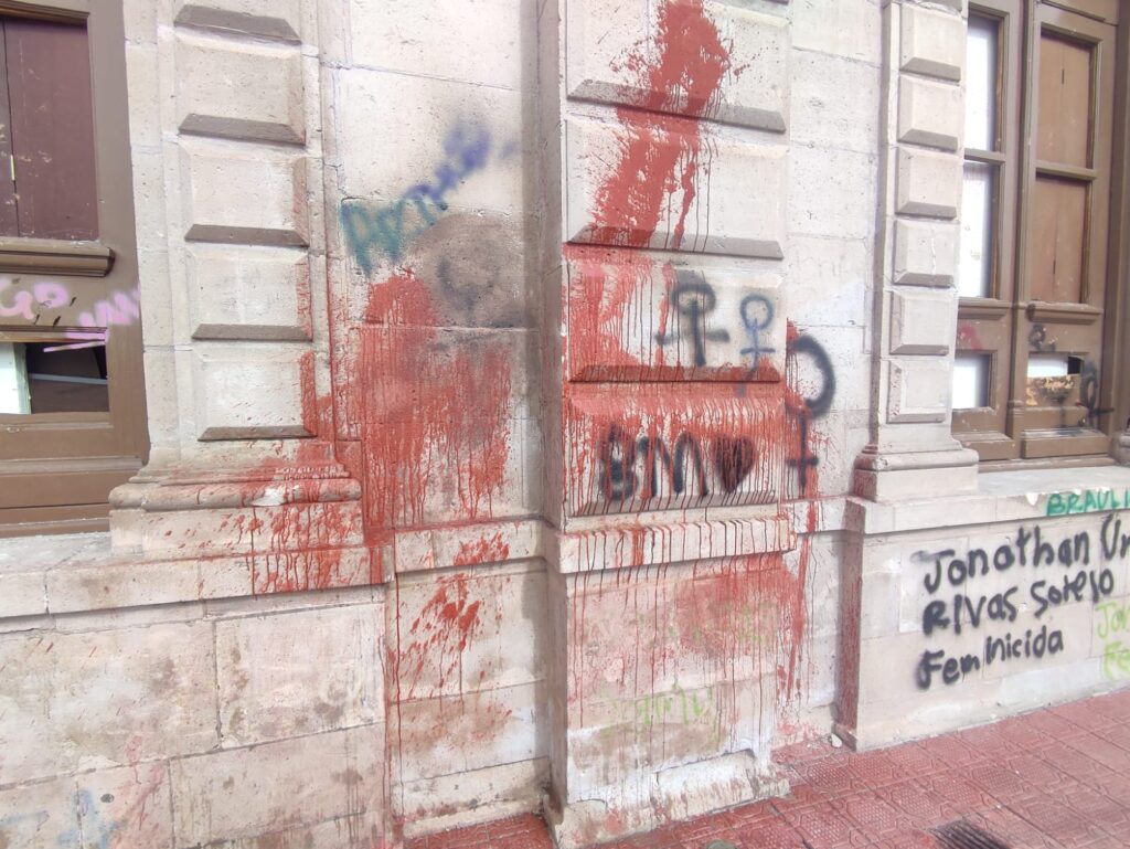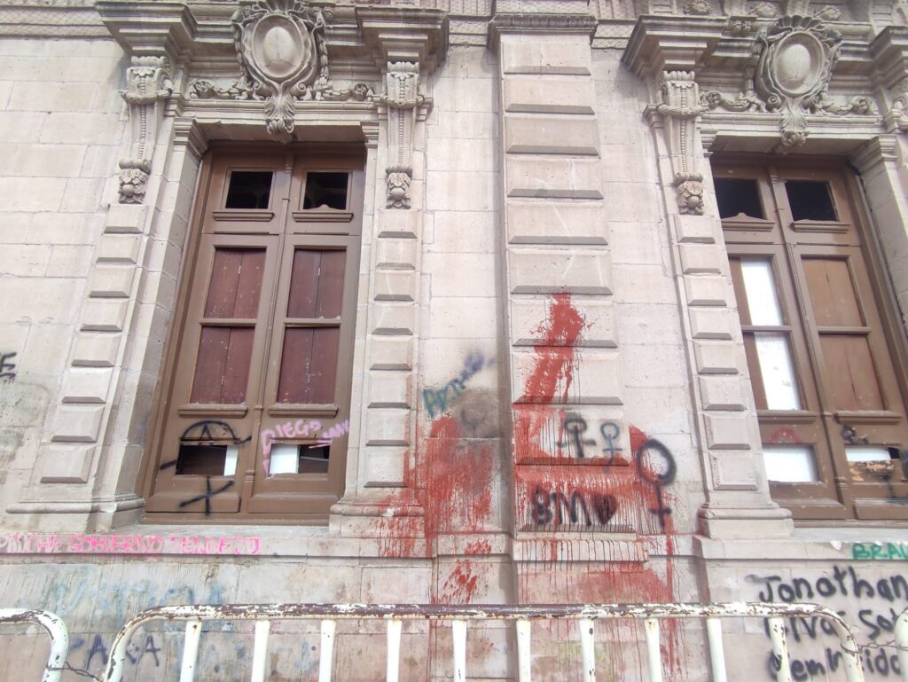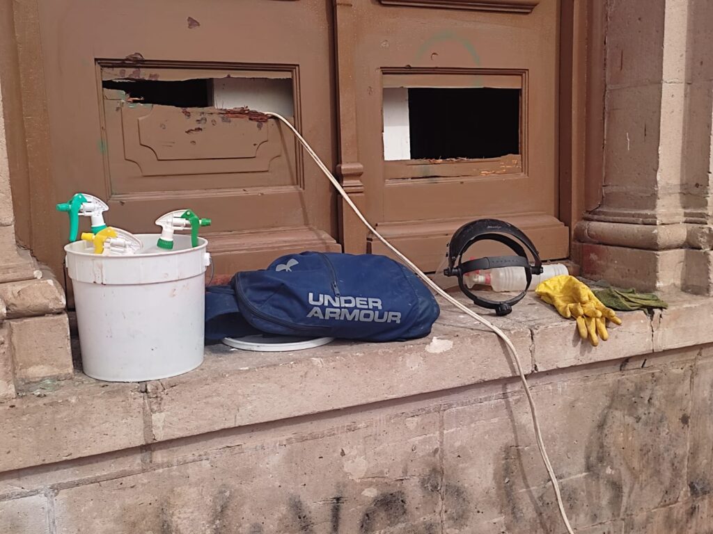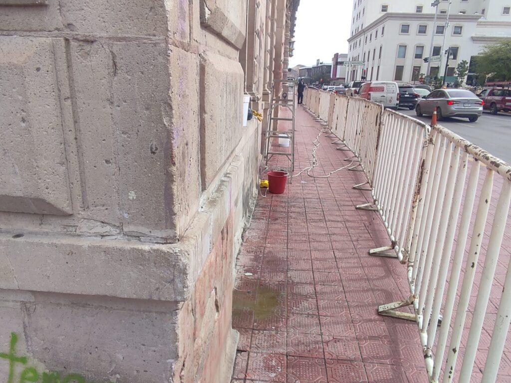 Empleados comenzaron a limpiar las pintas en Palacio de Gobierno que se generaron durante la marcha del Día Internacional de la Mujer el pasado 8 de marzo y tardarán más de 4 semanas para que quede limpio.