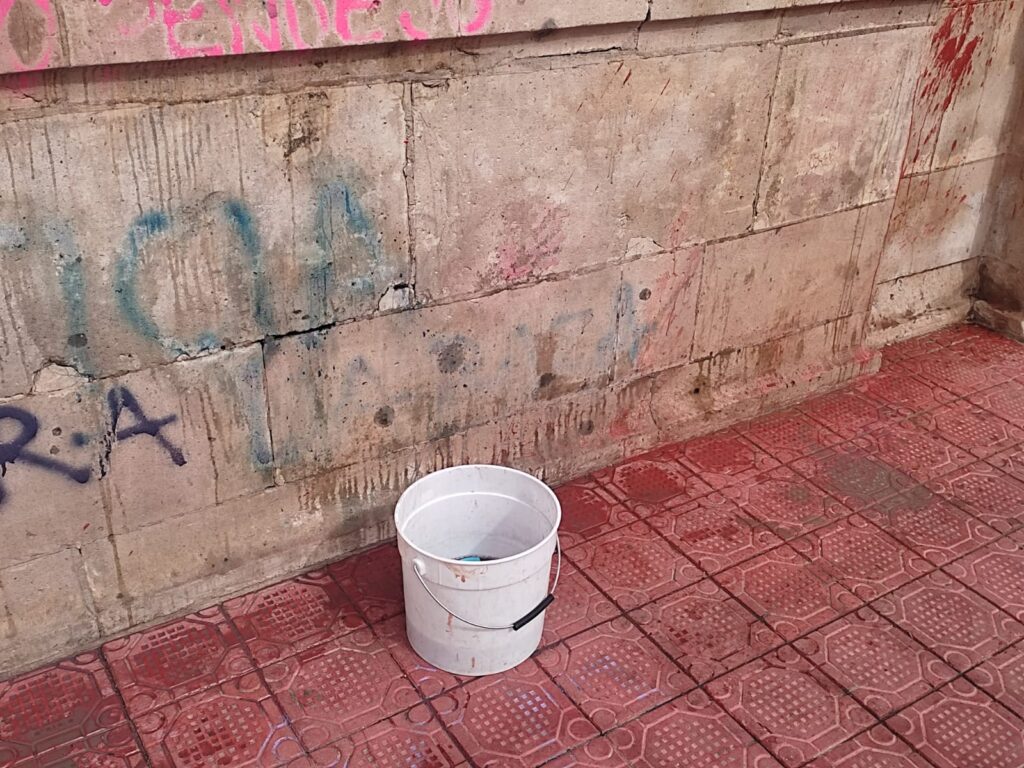 A pesar de que llevan 2 horas quitando las pintas, solamente han logrado limpiar alrededor de 3 metros lineales y sólo la parte de abajo del edificio.