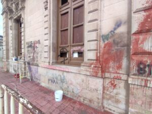 Empleados comenzaron a limpiar las pintas en Palacio de Gobierno que se generaron durante la marcha del Día Internacional de la Mujer el pasado 8 de marzo y
