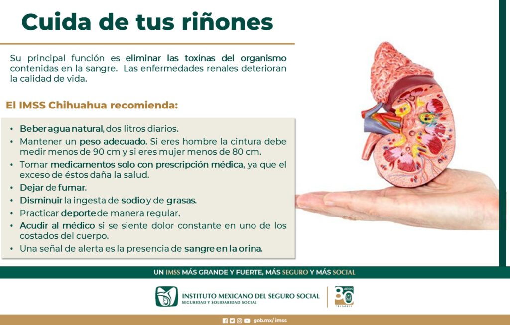 El Instituto Mexicano del Seguro Social (IMSS) en Chihuahua, través de la Coordinación de Salud Pública, emitió una serie de recomendaciones para el adecuado cuidado de los riñones.