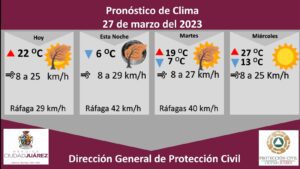 La Dirección General de Protección Civil, con base en informes del Servicio Meteorológico Nacional, pronostica un lunes soleado con ráfagas de viento de hasta 42 kilómetros por hora,