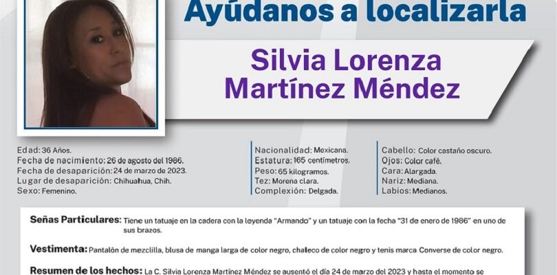 La Fiscalía Estatal, pidió la colaboración para dar con el paradero de Silvia Lorenza, de 36 años de edad, misma que desapareció en algún tramo de la rúa de Chihuahua a Delicias.